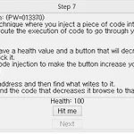 이번시간에는 Cheat Engine Tutorial-Step7 을 풀어보겠습니다. 이번 문제에서는 코드 인젝션에 대해서 알아보겠습니다. 리버싱 쪽에서 많이 사용하는 기법으로 임의의 어셈블리어를 원래 exe파일에는 없던 코드로 새로 삽입해서 우리가 원하는 흐름으로 이끌어 주는 것을 이야기합니다. 현재 Hit me를 눌러보면 Health가 1씩 줄어들고 있습니다.지금 1씩 줄어들고 있는 것을 Hit me를 누르면 2씩 증가하도록 바꾸는 것이 이번 문제입니다. 우선 값을 찾은 후 Find out what writes to this address 혹은 F6을 누릅니다. Hit me를 눌러서 값을 씌운 뒤에 클릭 후 Show disassembler를 클릭합니다. 그러면 이러한 디스어셈블러 창이 뜨게 됩니다. 저기..